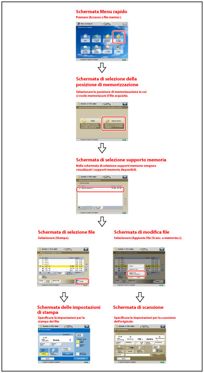 Per la procedura di [Aggiunta file (Scans. e memorizz.)] e le istruzioni sull'utilizzo della schermata di scansione, vedere "Aggiunta di un file (Scansione e memorizzazione)" e "Flusso delle operazioni di scansione e memorizzazione".