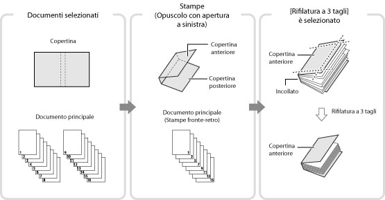 Se si utilizza carta da 80 g/m2 a 105 g/m2 per il documento principale e la stampa è superiore a 150 fogli, l'opuscolo potrebbe non essere creato a causa dello spessore. In tal caso si potrebbe verificare un inceppamento. Ridurre il numero di pagine del documento principale.
