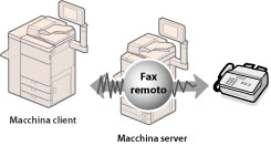 Utilizzando la funzione Remote Fax è possibile condividere la funzione fax con macchine server remote fax sulla stessa rete. I documenti acquisiti, i documenti memorizzati nella mailbox/mailbox RX memoria e i dati nel computer possono essere inviati utilizzando la macchina server per fax. È anche possibile inviare documenti a più indirizzi.