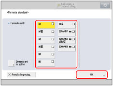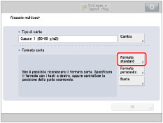 → digitare i valori corretti.Per selezionare un formato carta memorizzato in un tasto di formato (da [S1] a [S5]), occorre memorizzare preventivamente il formato carta irregolare nel tasto di formato. Per istruzioni su come conservare i formati carta non standard, vedere "Registrazione/modifica/eliminazione dei formati di carta personalizzati".