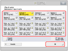 È possibile registrare tipi di carta diversi da quelli elencati in Impostazioni dettagliate per la selezione del tipo di carta. Per informazioni sulla registrazione di un tipo di carta personalizzato, vedere "Registrazione dei tipi di carta personalizzati".