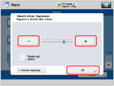 Se si regola la densità dello sfondo premendo [Regola] per <Densità sfondo>, l'impostazione [Autom.] viene annullata. Allo stesso modo, premendo [Autom.] durante le regolazioni manuali in [Regola], le regolazioni vengono annullate. La macchina regola automaticamente la densità in base allo sfondo.