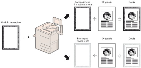Per utilizzare il modo Sovrapposizione immagine, l'immagine acquisita deve essere registrata precedentemente nella macchina. (Vedere "Registrazione di form per il modo Sovrapposizione immagine".)
