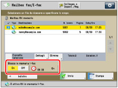 Se si imposta 'Off' per <Blocco in memoria I-Fax>, i file ricevuti con la funzione I-fax vengono stampati automaticamente ed eliminati dalla mailbox RX memoria.
