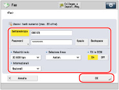 Premere [Impostazione dettagli] per impostare il sottoindirizzo, la password, TX in ECM, Velocità invio e Internazionali. Se sono state impostate più linee telefoniche sulla macchina, è possibile selezionare anche la linea da utilizzare per la trasmissione.