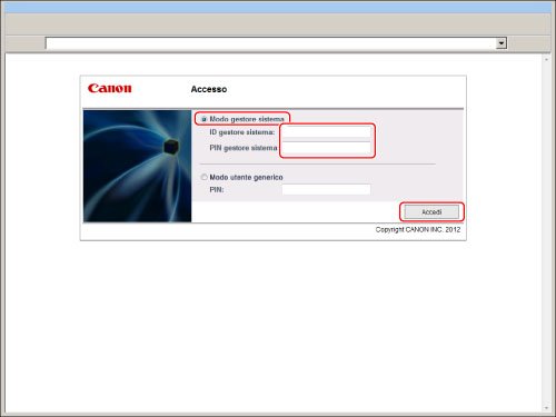 Il gestore del sistema e l'amministratore di sistema SSO-H (Administrator) possono specificare tutte le impostazioni di sistema della macchina. Per informazioni sui tipi di amministratori, vedere "Impostazioni amministratore". Per impostazione predefinita, la macchina richiede le impostazioni del gestore del sistema (ID gestore sistema/PIN sistema). Pertanto, l'amministratore deve accedere immettendo l'ID del gestore del sistema e il PIN del sistema. L'impostazione predefinita per entrambi è '7654321'. Si consiglia di modificare l'ID gestore sistema e il PIN sistema. Per ulteriori informazioni sull'impostazione dell'ID gestore sistema e il PIN sistema, vedere "Specifica delle impostazioni del gestore del sistema". Per informazioni sulle voci di Impostazioni/Registrazione disponibili con i privilegi di amministratore, vedere "Tabella delle impostazioni disponibili per gli amministratori (pannello digitale)" e "Tabella delle impostazioni disponibili per gli amministratori (IU remota)".