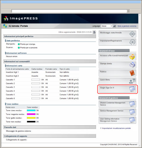 Se è stato immesso <http://<indirizzo IP o nome host della macchina>:8000/sso>, il menu principale viene visualizzato senza la schermata della IU remota descritta al punto 3.
