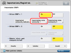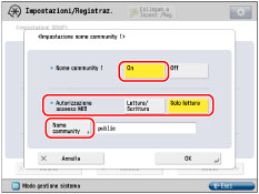 Premere [On] per <Utilizzo SNMPv1> → [Impostazioni community dedicata]. Premere [On] per <Community dedicata> → [Lettura/Scrittura] per <Autorizzazione accesso MIB>.