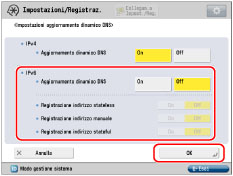 Se <Utilizzo DHCPv6> è stato impostato su 'On' al punto 7, il nome di dominio impostato manualmente viene sovrascritto. Anche se si imposta <Utilizzo stesso nome host/nome dominio di IPv4> su 'On', viene utilizzato il nome di dominio ottenuto dal server DHCPv6.