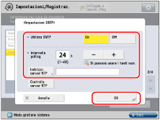 Premere [Impostazioni SNTP] per [Impostazioni TCP/IP] → specificare le voci indicate di seguito → premere [OK].