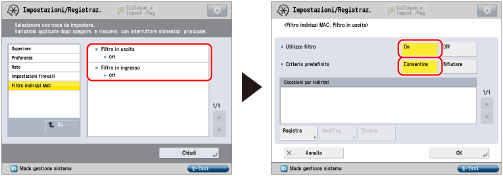 Premere [Filtro in uscita] o [Filtro in ingresso] per [Filtro indirizzi MAC] → [On] per <Utilizzo filtro> → [Consentire] per <Criterio predefinito>.