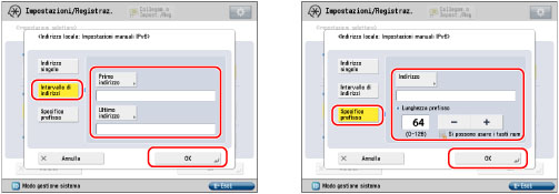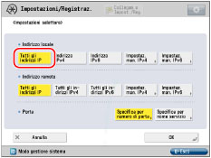 Per specificare un intervallo di indirizzi IPv6: premere [Intervallo di indirizzi]. Premere [Primo indirizzo] → immettere il primo indirizzo IPv6 → premere [OK]. Premere [Ultimo indirizzo] → immettere l'ultimo indirizzo IPv6 → premere [OK].