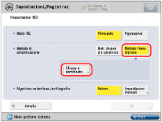 Premere [Metodo firma digitale] per <Metodo di autenticazione> → [Chiave e certificato].