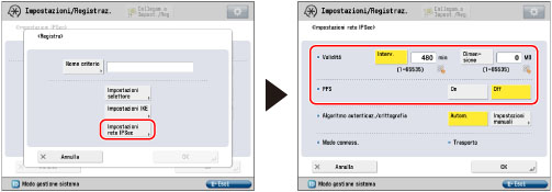 [Interv.] e [Dimensione] per <Validità>: specificare il periodo di validità di SA IKE e SA IPSec. Nelle comunicazioni IPSec a cui è applicato un criterio di protezione valido, i pacchetti possono essere inviati e ricevuti senza negoziazioni per lo scambio di chiavi. Accertarsi di impostare [Interv.] o [Dimensione]. Se si impostano entrambe le opzioni, l'associazione SA perde validità quando viene raggiunto il valore impostato per [Interv.] o [Dimensione].