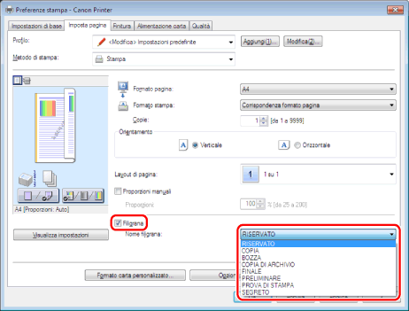 Selezionare [Filigrana] → selezionare la filigrana per la stampa.