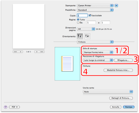 Le impostazioni disponibili potrebbero variare a seconda del sistema operativo e dell'applicazione e anche a seconda del tipo e della versione del driver di stampa.
