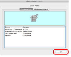 Se il nome del driver della stampante visualizzato nella parte superiore della finestra di dialogo [Informazioni stampante] e il nome della stampante visualizzato come [Nome recuperato dalla stampante] non corrispondono, potrebbe non essere possibile utilizzare correttamente le funzioni della stampante. Se i nomi non corrispondono, eliminare la stampante aggiunta in [Preferenze di Sistema], quindi aggiungerla nuovamente. Per maggiori informazioni vedere la Guida del driver della stampante (vedere " Installazione").