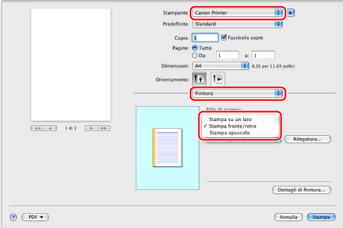 Selezionare la stampante → [Finitura] → selezionare [Stampa su un lato] o [Stampa fronte/retro] da [Stile di stampa].