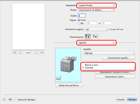 Selezionare la stampante → [Qualità] → [Bianco e nero] o [Colorata] da [Modo colore].