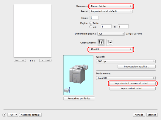Selezionare la stampante → [Qualità] → fare clic su [Impostazioni numero di colori].