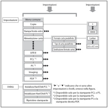 Dal menu Impostazioni stampante è possibile accedere alle funzioni comuni. La figura riportata di seguito illustra la struttura del menu Impostazioni stampante.