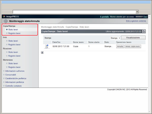Questo pulsante consente di visualizzare il Registro lavori di stampa locale, compresi i processi salvati nella Mailbox RX memoria o nelle Mailbox fax riservati.