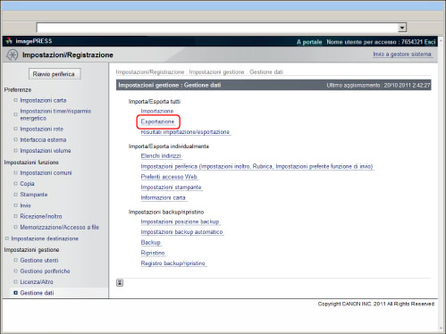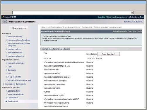 È inoltre possibile controllare gli ultimi risultati di importazione/esportazione premendo [Gestione dati] per <Impostazioni gestione> → [Risultati importazione/esportazione].