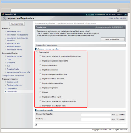 Durante l'operazione Esporta tutti, non è possibile utilizzare la IU remota per eseguire operazioni (Monitoraggio stato/Annulla, Impostazioni/Registrazione, Accesso a file ricevuti/memorizzati, Rubrica, Stampa diretta).