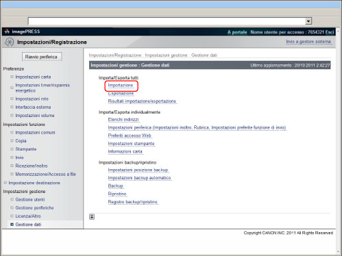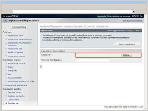 Per abilitare le impostazioni importate è necessario riavviare la macchina. Dopo l'importazione, non sarà possibile utilizzare l'IU remota per eseguire altre operazioni sino al riavvio della macchina. Spegnere e riaccendere la macchina con l'interruttore principale. (Vedere "Alimentazione principale e tasto risparmio energetico".)