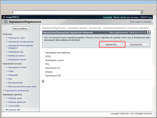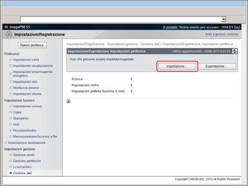 Dopo avere importato le impostazioni della periferica, l'IU remota non può essere utilizzata per eseguire altre operazioni finché la macchina non viene riavviata. Spegnere e riaccendere la macchina con l'interruttore principale.