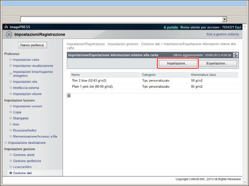 Per applicare le impostazioni della periferica importate, occorre riavviare la macchina. Al termine dell'importazione, spegnere e riaccendere la macchina con l'interruttore principale.