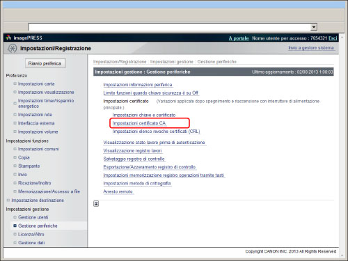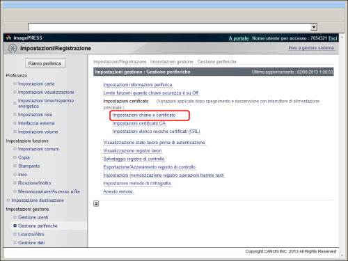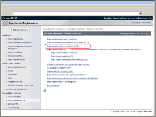 È possibile utilizzare l'IU remota per installare la coppia di chiavi, il certificato di utente e l'elenco delle revoche dei certificati necessari per le firme degli utenti nella macchina.