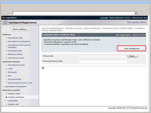 Fare clic su [Impostazioni chiave e certificato] → [Registrazione chiave e certificato] → [Installazione...].