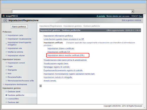 Questa funzione consente di registrare/controllare/eliminare un elenco delle revoche dei certificati (CRL).