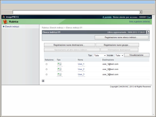 Le operazioni di gestione della rubrica disponibili mediante l'IU remota sono uguali a quelle ottenute con la selezione della schermata [Impostazione destinazione] (Impostazioni/Registrazione) nel pannello comandi.