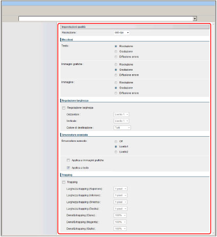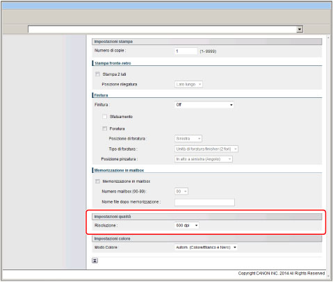 La risoluzione è espressa in unità di dpi (dots per inch), ossia il numero di punti in un pollice. Più alto è il valore, maggiore sarà la risoluzione, con una migliore resa dei dettagli. Se è selezionato [600 dpi], è possibile eseguire stampe adatte a