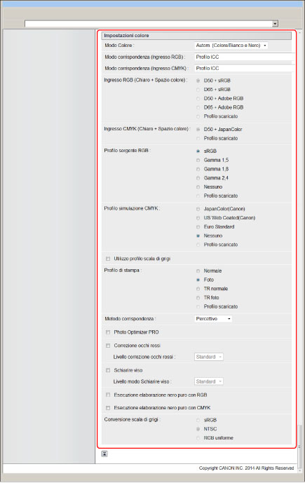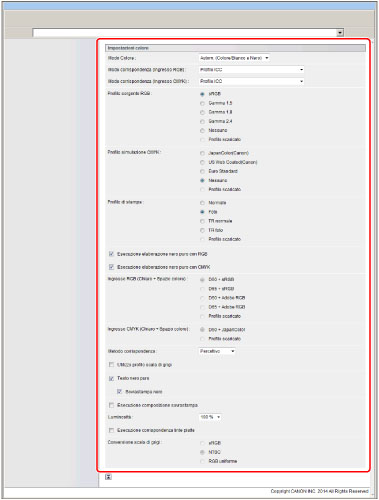 Questa impostazione utilizza il target di simulazione personalizzato che è stato scaricato dal computer host in questa macchina mediante iW Management Console. Potrebbe non essere possibile utilizzare tutti i profili disponibili. Se dei dati a colori vengono stampati in grigio mediante un profilo scaricato, controllare la compatibilità di quest'ultimo.