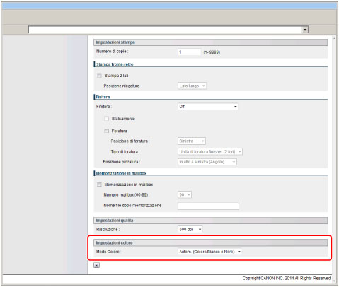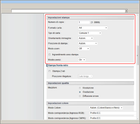 Se è selezionato [In alto a sinistra], l'immagine viene stampata nella parte superiore sinistra della carta indipendentemente dal fatto che la posizione di stampa dell'immagine sia o meno specificata.