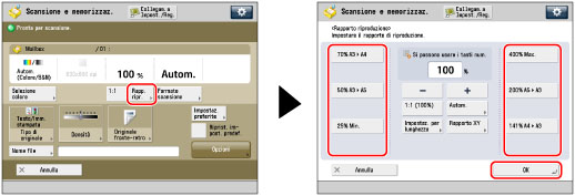 Questo modo consente alla macchina di selezionare automaticamente il rapporto di zoom in base al formato di registrazione selezionato. I rapporti di zoom disponibili vanno dal 25% al 400% per la funzione Mailbox e dal 50% al 200% per la funzione Supporto memoria. Viene utilizzato lo stesso rapporto di zoom per gli assi orizzontale e verticale.
