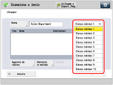 La funzione Indirizzo di gruppo consente di creare un gruppo. In un singolo gruppo è possibile registrare diversi tipi di destinazioni (come ad esempio e-mail, I-fax, file server o mailbox).