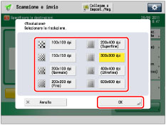 → [Scansione e invio] → specificare la destinazione → premere il pulsante della risoluzione.