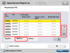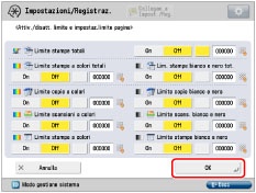 .Il limite al numero di pagine che possono essere generate può essere impostato tra 0 e 999.999 pagine. Una volta raggiunto il limite delle pagine, non è possibile continuare con la copiatura, la scansione o la stampa.