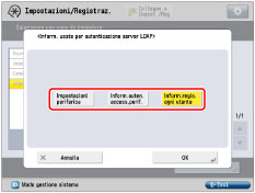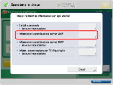 Utilizza le informazioni di autenticazione impostate in [Registrazione server LDAP]. (Vedere "Registrazione di un server LDAP".) Non sono richieste ulteriori impostazioni per ciascun utente.