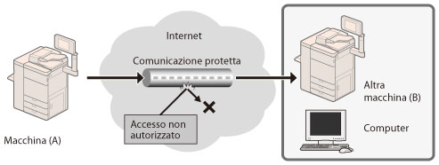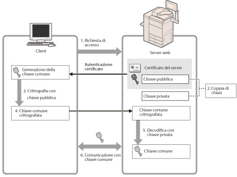 È possibile avere una comunicazione protetta crittografata quando l'utente accede alla macchina via browser installando un certificato di server sulla macchina stessa. Con la comunicazione SSL, utilizzando il certificato di server e la chiave pubblica, viene generata una chiave comune che può essere utilizzata solo dall'utente e dalla macchina. In questo modo, si impedisce l'intercettazione e la sottrazione dei dati. Vedere