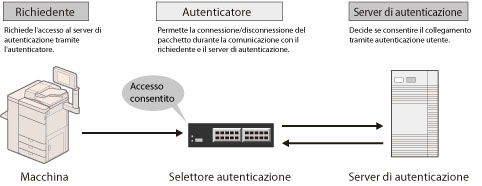 Questo sistema gestisce le informazioni di autenticazione tramite il server di autenticazione (RADIUS: Remote Authentication Dial In User Service) e autentica il richiedente. È possibile impedire l'accesso non autorizzato perché solo il richiedente autenticato dal server RADIUS dispone dell'autorizzazione per essere collegato alla rete da parte dell'autenticatore.