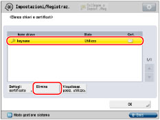Le coppie di chiavi per cui 'Utilizzo' viene visualizzato in <Stato> non possono essere eliminate perché sono in uso con l'autenticazione IEEE802.1X/con IPSec o perché SSL è impostato su 'On'. Premere [Visualizzaz. posiz. utilizzo] per controllare il tipo di protezione per cui è utilizzata la coppia di chiavi. Per eliminare una coppia di chiavi utilizzata solo con SSL, specificare le seguenti impostazioni su 'Off'. Una coppia di chiavi utilizzata per l'autenticazione IEEE802.1X/per IPSec non può essere eliminata.
