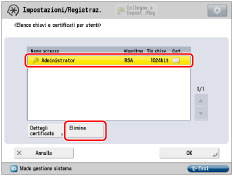 Per informazioni su come un utente generico può visualizzare il certificato di utente, vedere "Controllo di una firma di periferica/del certificato di firma di utente". In questo caso, però, viene visualizzato solo il certificato di utente dell'utente che sta accedendo al momento alla macchina. I certificati di utente degli altri utenti non vengono visualizzati. Inoltre, il certificato di utente non può essere eliminato da questa schermata. Per eliminare il proprio certificato di utente, un utente generico deve utilizzare l'IU remota. (Vedere "Installazione di un file di certificato".)