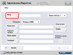 Per le istruzioni su come specificare ciascuna impostazione per FTP, Windows (SMB) e WebDAV, vedere "Specifica di un file server con la tastiera".