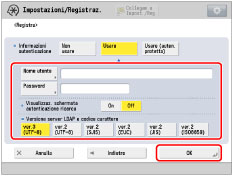 Se la versione del server LDAP è la 3, non è necessario specificare [Posizione inizio ricerca]. (Se la versione del server LDAP è la 3, la macchina preleva automaticamente le impostazioni dal server e imposta la posizione di inizio ricerca). Se la versione del server LDAP è la 2, è invece necessario specificare [Posizione inizio ricerca].
