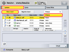 Se si seleziona un lavoro di stampa e si preme [Dettagli], premere [Alimentazione carta] per forzare la stampa dei dati rimanenti in memoria e premere [Ignora errore] per disabilitare temporaneamente gli errori e continuare la stampa. [Alimentazione carta] e [Ignora errore] possono essere utilizzati solo per lavori di stampa inviati dal computer.